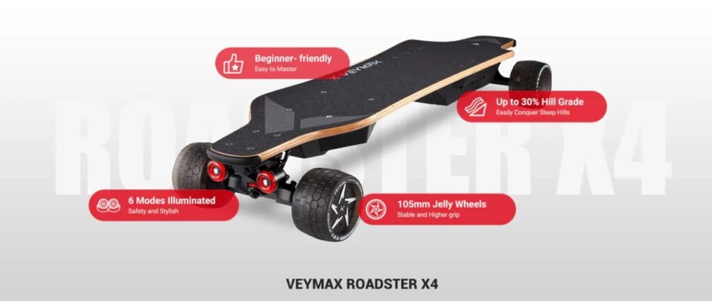 Boards like the VEYMAX Roadster X4 are meant to lower anxiety about instability. A strong deck and improved tail structure provide extra control for carving, turning, or negotiating tighter courses. Good deck stability turns directly into improved general control for new riders.